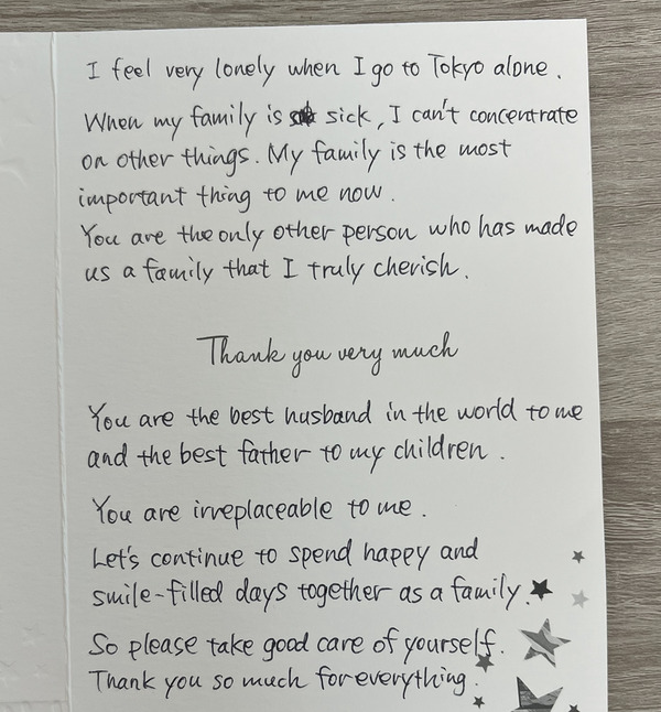 父の日、夫にまじめに手紙を書いた 2023年06月18日 今日は父の日チャンポンは出張で上海にいるので一緒には過ごせないけど。久しぶりにまじめに手紙を書きました。先日のコロナ陽性騒動もそうだったけどいまの私にとって一番大切なのは家族なんだなぁと最近実感していて。言葉にすると月並みだけど。でもこんな風に「一番大切